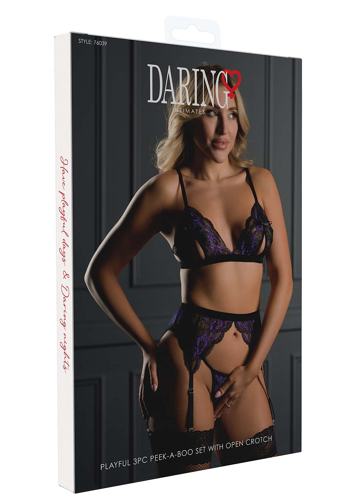 Daring Intimates 3PC Peek-A-Boo Bow Set Open Crotch (Purple), čipková súprava s podväzkami