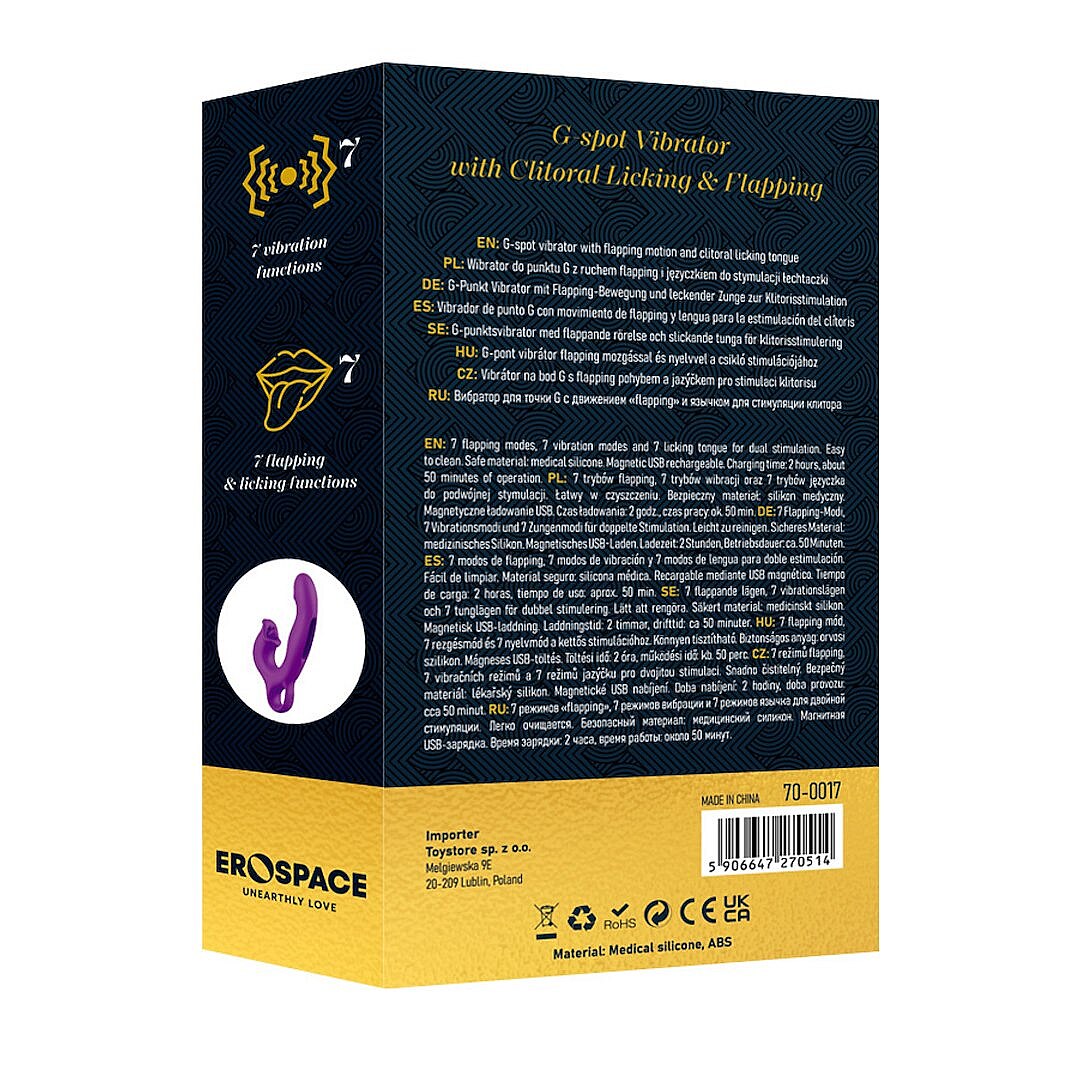 Erospace Sweet Play A17 G-Spot Vibrator vás rozmazná tromi zdrojmi rozkoše. Modelovaná špička mieri na G‑bod s precíznou presnosťou. Pohyblivé „páriky“ verne napodobňujú lízanie klitorisu a vytvárajú vlny šteklenia. Centrálny jazýček jemne masíruje vnútro vagíny a pridáva intenzitu presne tam, kde ju chcete. 7 režimov párikov, 7 vibrácií a 7 režimov jazýčka umožní miešať rytmy podľa nálady – od nehy po dráždivé crescendo. Ergonomická rukoväť drží isto, aj keď sa kolená podlamujú. Tichý, no silný motor poskytuje diskrétnu, no výraznú stimuláciu. Hebký lekársky silikón v kombinácii s ABS je hypoalergénny a bezpečný pre pokožku. Vodotesnosť IPX7 láka do sprchy aj vane. Magnetické USB nabíjanie je pohodlné, s výdržou do 50 minút a nabíjaním približne 120 minút. Kompaktné rozmery 200 × 97 × 40 mm a hmotnosť 226 g sedia do ruky ako uliate.