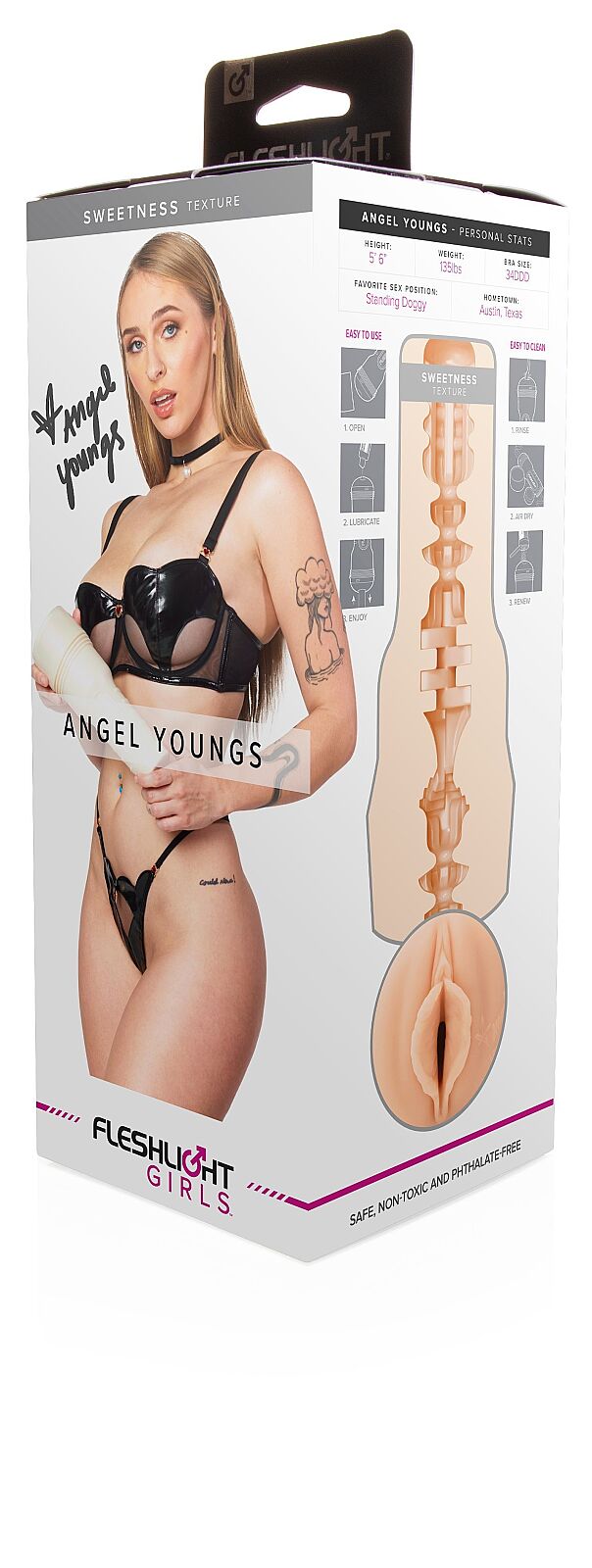 Fleshlight Girls ANGEL YOUNGS Sweetness s realistickým odliatkom pyskov pyskov a klitorisu podľa herečky ANGEL YOUNGS je z jemného materiálu, ktorý umožní vniknúť tak hlboko, ako len chcete. Nič nedokáže tento pocit napodobniť vernejšie, hĺbka aj rozťažnosť dostatočná ako pre menšie, tak aj pre veľké penisy.