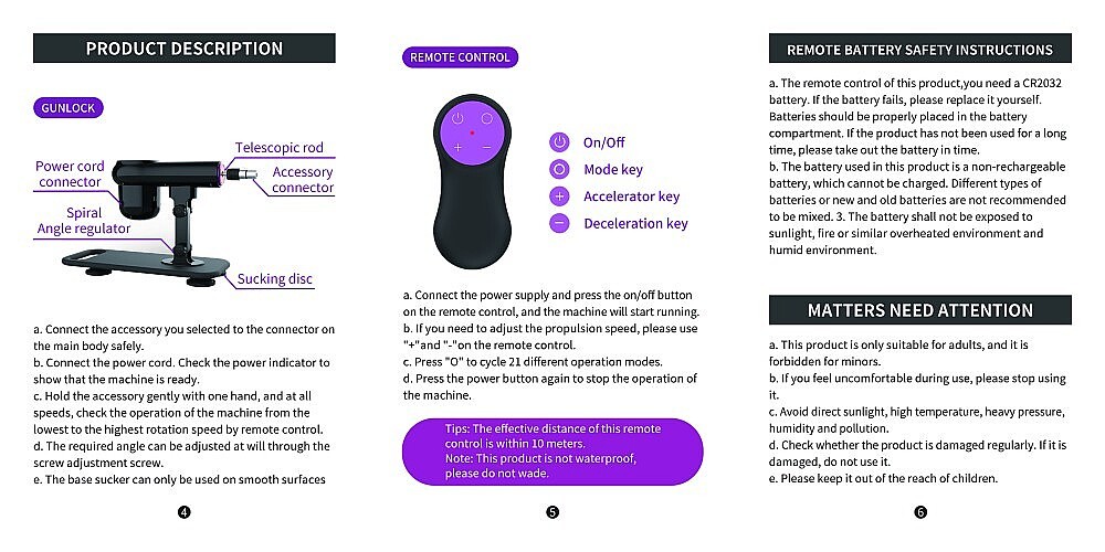 Mistress Sex Machine A1 je stvorená na hravé experimenty a intenzívne potešenie. Pevná konštrukcia z ABS a kovov drží tempo, aj keď pridáte na plyne. Bezdrôtové diaľkové ovládanie s dosahom 10 m vám dáva voľnosť veliť akcii; stiskom „+“ zrýchlite, „-“ spomalíte a tlačidlom „O“ si preklikáte 21 režimov – od nežného podpichovania až po pulzujúcu búrku. Prirážky 1–7× za sekundu sa postarajú o jemné vlny i divoké tempo, zatiaľ čo zdvih do 6 cm poskytne lahodné naplnenie presne tam, kde ho chcete. Mistress Sex Machine A1 stojí isto vďaka dvom silným prísavkám, ktoré sa prisajú k hladkému povrchu a držia, keď to začne byť vášnivé. Nastaviteľný uhol – horizontálne aj vertikálne – vám dovolí loviť správny bod slasti a meniť polohy podľa chuti. Napájanie káblom drží výkon stabilný a pripravený na dlhé session. Po hre stačí vlažná voda so saponátom a čistič hračiek, kvapka lubrikantu na vodnej báze a ide sa odznova. Dildo, vyrobené z hladkého TPE, je súčasťou balenia.