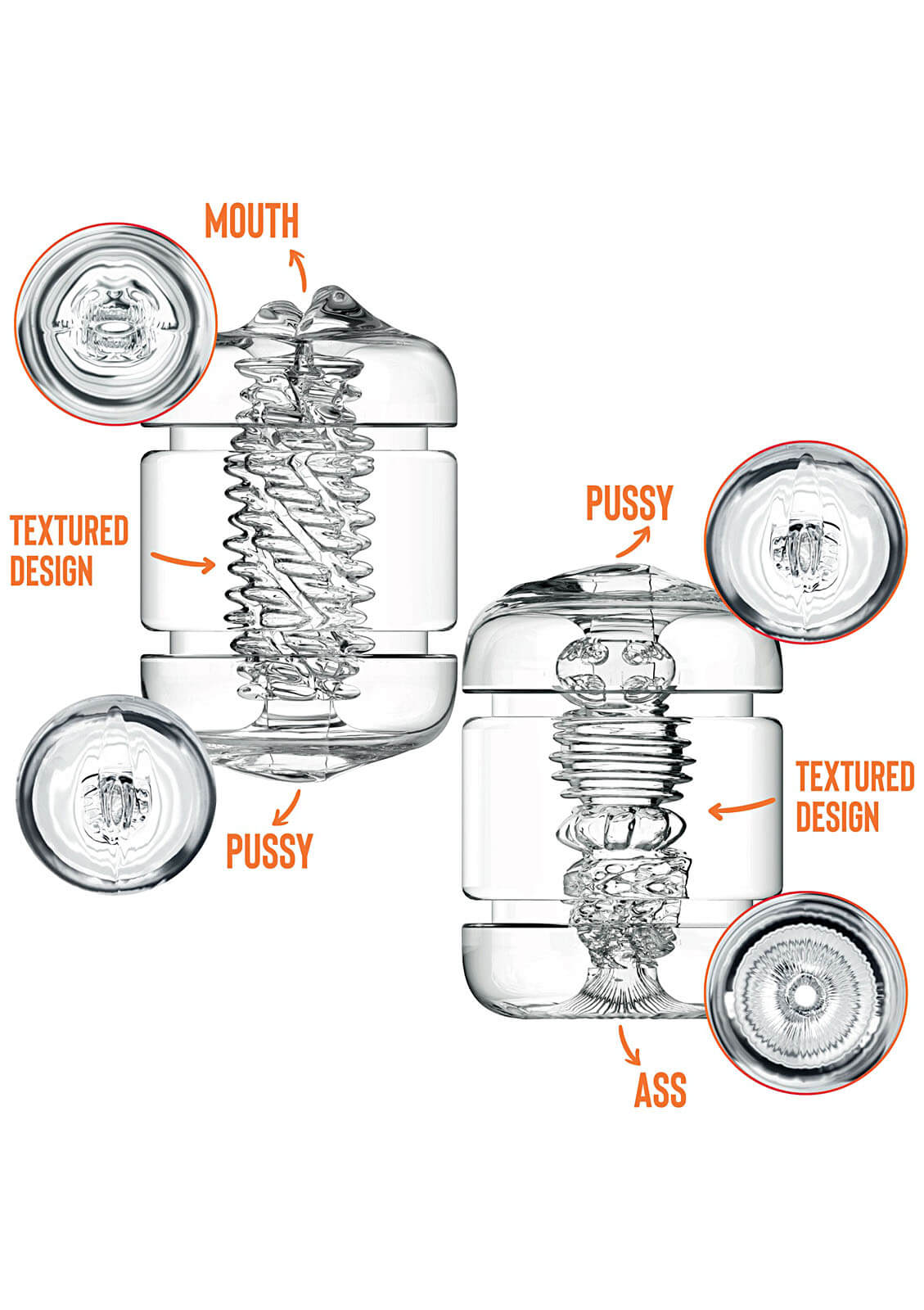 Zažite dokonalé vizuálne vzrušenie, keď sledujete, ako vaše telo reaguje na každý pohyb vďaka priehľadnému designu. Nechajte sa pohltiť dvoma rôznymi koncami, ktoré imitujú nielen pohľad, ale aj pocit pravého zadočku, vulvy a úst. S Private Clear Shot Double Masturbator môžete prežívať rôznorodé zážitky bez nutnosti zmeny pomôcky.