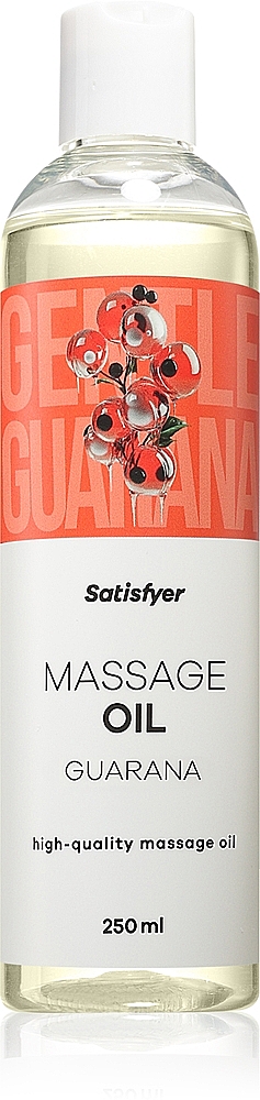 Satisfyer Massage Oil 250 ml (Guarana) rozprúdi energiu a prebudí fantáziu. Výrazná, no jemná vôňa guarany s tónmi praženej kávy rozohreje vášne, zatiaľ čo čokoládové a vanilkové nuansy hladia zmysly do úplného uvoľnenia. Jeho hodvábna textúra kĺže ako po masle, zvýrazní krivky a pozve prsty k dlhším, hravým dotykom. Vyživujúce rastlinné oleje zanechajú pokožku mäkkú a pružnú, aby bol každý ťah pozvaním k ďalšiemu kolu. Energizujúci efekt dodá masáži pulzujúce tempo a po dlhom dni vráti chuť na nežné aj odvážnejšie hry. Neutrálne, jemné zloženie je mnohostranné – prinesie partnerským masážam hravý spád a pri self-care zmení kúpeľňu na súkromné spa. Stačí malé množstvo do dlaní, jemne vmasírovať a nechať, nech sa okamžite rozvinie jeho hýčkajúce kúzlo; ak chcete viac, jednoducho pridajte pár kvapiek. Podpisová juhoamerická vôňa každému dotyku dodá exotický akcent a pripomenie, že pokožka si zaslúži rozmaznávanie rovnako ako túžby.