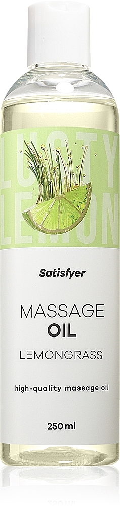 Satisfyer Massage Oil 250 ml (Lemongrass) hýčka pokožku výživnou zmesou rastlinných olejov a zanecháva ju zvodne hladkú. Jeho svieža citrónová aróma prináša energiu a hravosť, takže každá masáž je šťavnatým zážitkom. Ľahká, nemastná textúra kĺže po koži ako hodváb a zanecháva len jemný, pestujúci film – bez ťažkého pocitu. Sunflower, Soy a Jojoba oleje vyživujú do hĺbky, pokožka je vláčna a príťažlivo hebká. Vitamin E (Tocopherol) pomáha chrániť a zjemňovať, takže vaše rituály budú ešte zmyselnejšie. Vďaka jemnému a univerzálnemu zloženiu je olej skvelý na spontánne chvíle aj dlhé relaxačné rituály – kedykoľvek si poviete. Okamžitý účinok sa rozvinie v priebehu pár sekúnd a vaše ruky sa rozbehnú po sviežej stope citrusov. Jednoduchá aplikácia umožní kedykoľvek počas hry pridať pár kvapiek pre plynulý sklz. Citrusová nota lemongrass povzbudí náladu a rozprúdi fantáziu – ideálne pre párové večery aj hravú relaxáciu osamote.