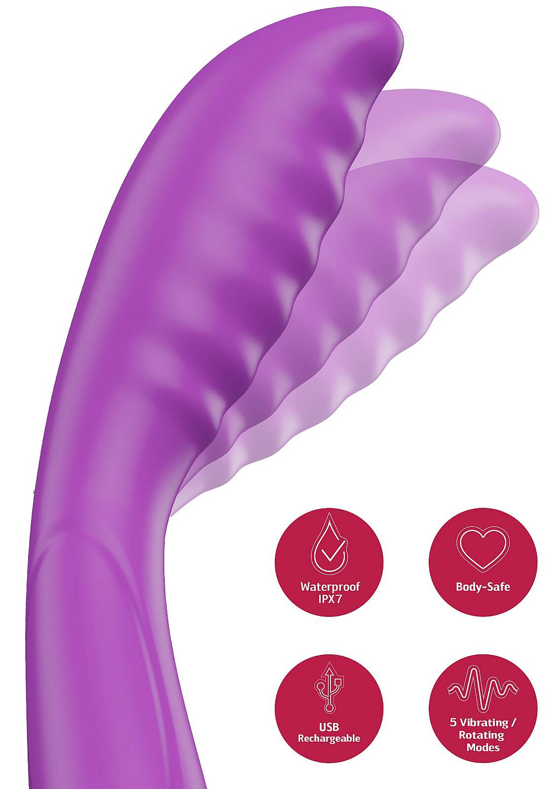 She.E.O Tapping G-Spot Vibrator budí zmysly rebrovanou hlavicou, ktorá sa pohybuje v širokom uhle a napodobňuje dráždivé prstovanie – cieli priamo na G‑bod. Vibrujúce telo zosilňuje zážitky hlbokými vibráciami a masíruje každé zákutie. 10 režimov vibrácií a 10 režimov ťukania ti umožní doladiť intenzitu podľa nálady – od nežnej špičky po odvážne vlny. Telový silikón je hebký, bezpečný a rebrovanie pridá zvodné trenie. Dobíjateľný Li‑Ion motor ponúkne až 60 min potešenia a za 90 min je späť v akcii. Vďaka IPX7 vodotesnosti sa hrá aj v sprche či vani a čistenie je bez starostí. 16 cm zasunuteľných (celkom 18 cm) a hmotnosť 140 g zaručia komfort a presnosť. V elegantnej fialovej rozžiari každé intímne dobrodružstvo.