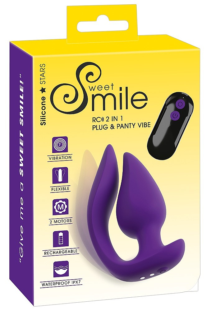 Sweet Smile RC 2 In 1 Plug & Panty Vibe je huncút do nohavičiek, ktorý zároveň vyplní aj poteší zvonka. Silikónový plug s úzkou špičkou sa vkladá vaginálne aj análne ľahko a pohodlne, zatiaľ čo priložiteľná časť jemne objíme vulvu a klitoris alebo rozmazná hrádzu. Dva tiché, no výkonné motory ponúkajú 7 pestrých vibračných režimov, ktoré prepnete priamo na tele hračky alebo cez diaľkový ovládač s dosahom do 8 metrov – ideálne aj pre párové škádlenie. Vodotesné telo pozýva do sprchy aj do vane. Hebký silikón sa pružne prispôsobí telu a je úplne bezpečný aj pre análnu zábavu. Vstavaný akumulátor dobijete cez USB a kábel nájdete v balení. Ovládač potrebuje 1× AAA batériu (dokúpte zvlášť). S Sweet Smile RC 2 In 1 Plug & Panty Vibe sa z tajného flirtu stane pikantný rituál – doma, na cestách i vonku.
